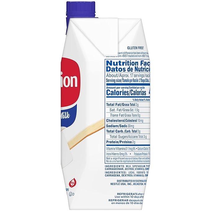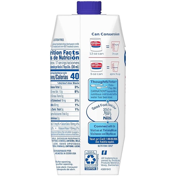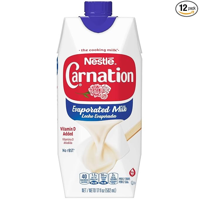 Nestle Carnation Evaporated Milk is key to making rich and decadent recipes that taste their best. With Vitamin D added, this Carnation milk is gluten free and contains no rBST. Use Carnation Evaporated Milk as an ingredient in creamy mac and cheese, velvety mashed potatoes and your most decadent desserts. Taste the Carnation difference. Nestle Carnation has been bringing you evaporated milk since 1899 to add a rich and creamy touch to desserts, soups, sauces, beverages and more. Store Nestle Carnation evaporated milk in a cool, dry place. When ready to use, simply open the carton. The reclosable bottle makes it easy to store the remaining Carnation Vitamin D added evaporated milk in the refrigerator, so you don’t have to waste anything. No significant difference has been shown between milk derived from rBST-treated and non-rBST treated cows.
