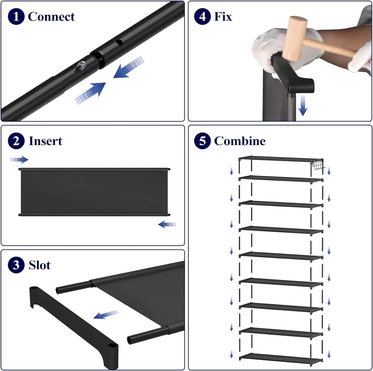 • EASY TO ASSEMBLE: Kisture metal shoe rack comes with a detailed instruction manual and installation video. It is easy to assemble without extra tools. Attached are gloves and a hammer as optional tools to protect your hands during installation.