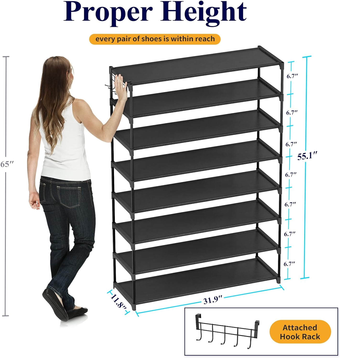 • LARGE CAPACITY: The Kisture 9-tier closet shoe rack organizer (31.9” L x 11.8” W x 55.1” H) with its 6.7” tier space can house 36-45 pairs of shoes of all styles. Its 11.8” depth accommodates even shoes up to US size 12! This tall shoe rack includes a hook rack that provides extra space for bags, keys, and other accessories.