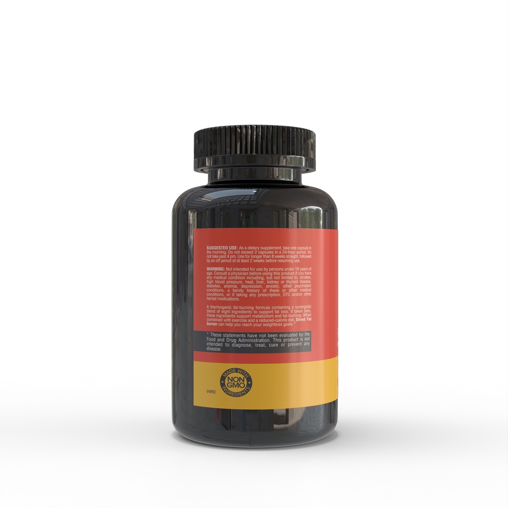 Shred Fat Burner is a natural supplement containing properties that aid in energy and focus. It works to increase muscle strength, fat metabolization and increase mental acuity.